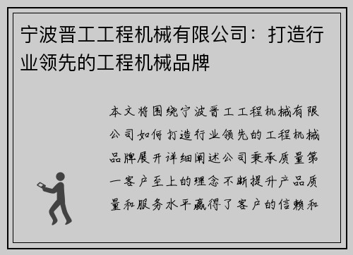 本文将围绕宁波晋工工程机械有限公司如何打造行业领先的工程机械品牌展开详细阐述。公司秉承“质量第一,客户至上”的理念,不断提升产品质量和服务水平,赢得了客户的信赖和好评。公司注重技术创新和研发投入,不断推出具有竞争力的新产品,满足市场需求。公司还重视市场营销和品牌推广,通过多种渠道提升品牌知名度和市场份额。公司注重人才培养和团队建设,打造了一支技术过硬、团结协作的专业团队。公司还注重社会责任和环境保护,致力于可持续发展。通过以上方面的努力,宁波晋工工程机械有限公司已经成为行业领先的工程机械品牌。