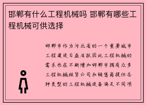 邯郸市作为河北省的一个重要城市,工程建设日益活跃,因此工程机械的需求也在不断增加。邯郸市拥有众多工程机械租赁公司和销售商,提供各种类型的工程机械设备,满足不同项目的需求。下面将介绍邯郸市常见的工程机械设备。